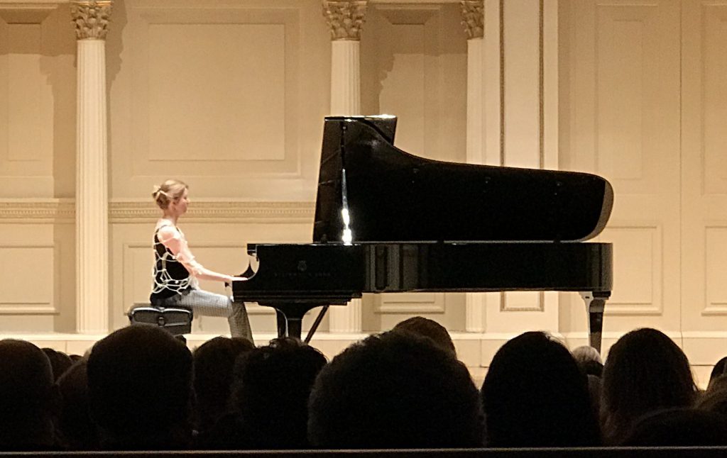 Christina Kobb performing at Carnegie Hall, February 24, 2017. Employing a modified “reconstructed” 19th-century keyboard technique allows her a faithful expression of early Romantic music on a powerful concert grand.